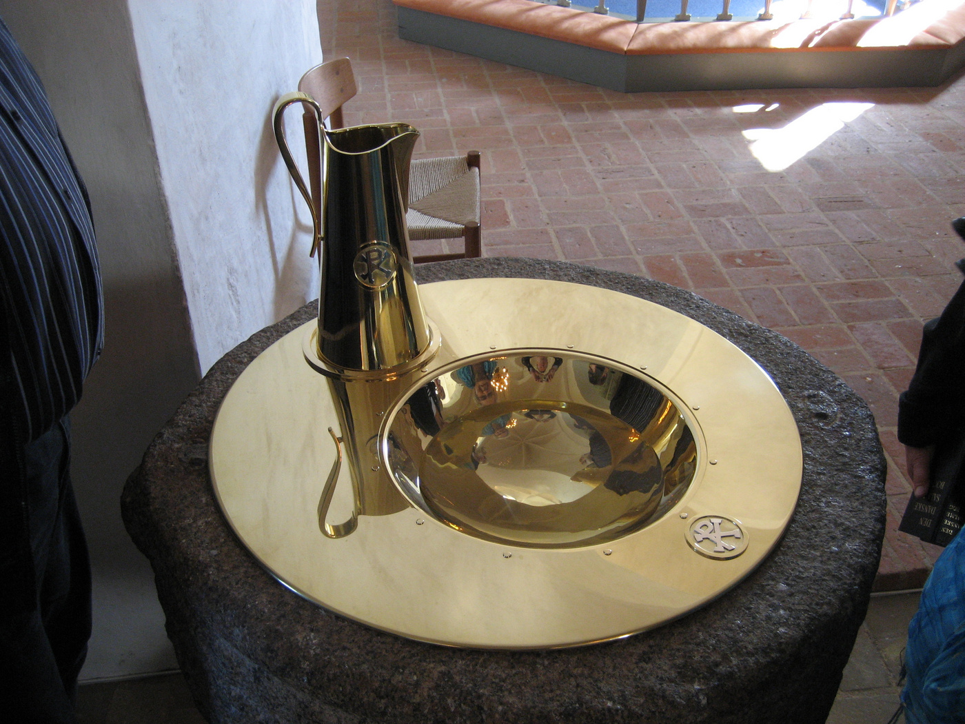 Dåbssættet til døbefonten er lavet i 2009 af guldsmed Søren Weitemeyer fra Århus, og består af et fad og en kande i messing. På begge dele er anbragt Kristi monogram, der også sidder på alteret og er blevet Søndersø Kirkes logo. Det gamle dåbsfad fra 1500-tallet var med tiden blevet slidt op, og havde flere huller i bunden. Det er nu restaureret og ophængt i den nordre korsarm.