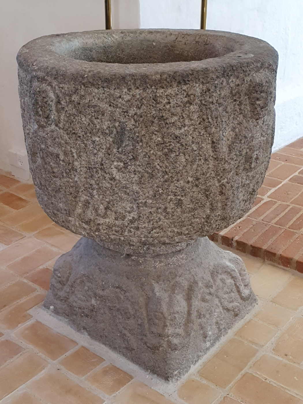 Man har haft den tankegang, at hedninger ikke måtte komme for langt ind i kirken, før de blev døbt, derfor var døbefonten oprindeligt anbragt ved indgangen. Der har været nogle trin op til døbefonten, formentlig en to-tre stykker, så man skal forestille sig, at døbefonten har stået højt, og at billederne skulle ses skråt nedefra.