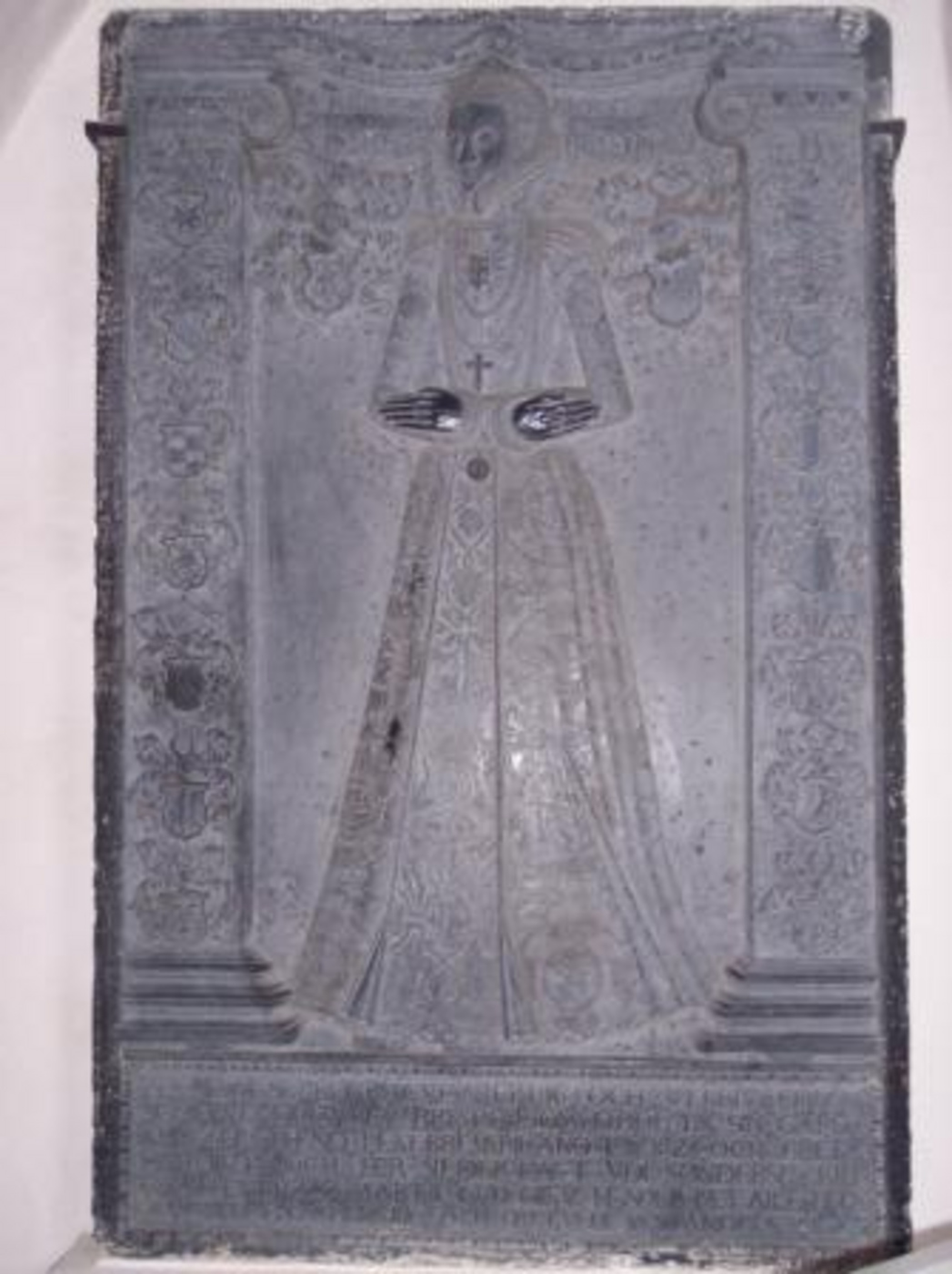 Stenen er sat over Elisabeth Bryske; en datter i familien Bryske til Dallund, der døde ung i året 1582. Man har poleret hendes hænder, og hendes kjole fremstår så selv de mindste detaljer i dens udsmykning kan studeres. Afdøde har på stenens gengivelse ringe på så mange fingre, at det har været umuligt for hende at arbejde. På den måde har man vist, at her var tale om en standsmæssig person, som ikke behøvede udføre arbejde.
