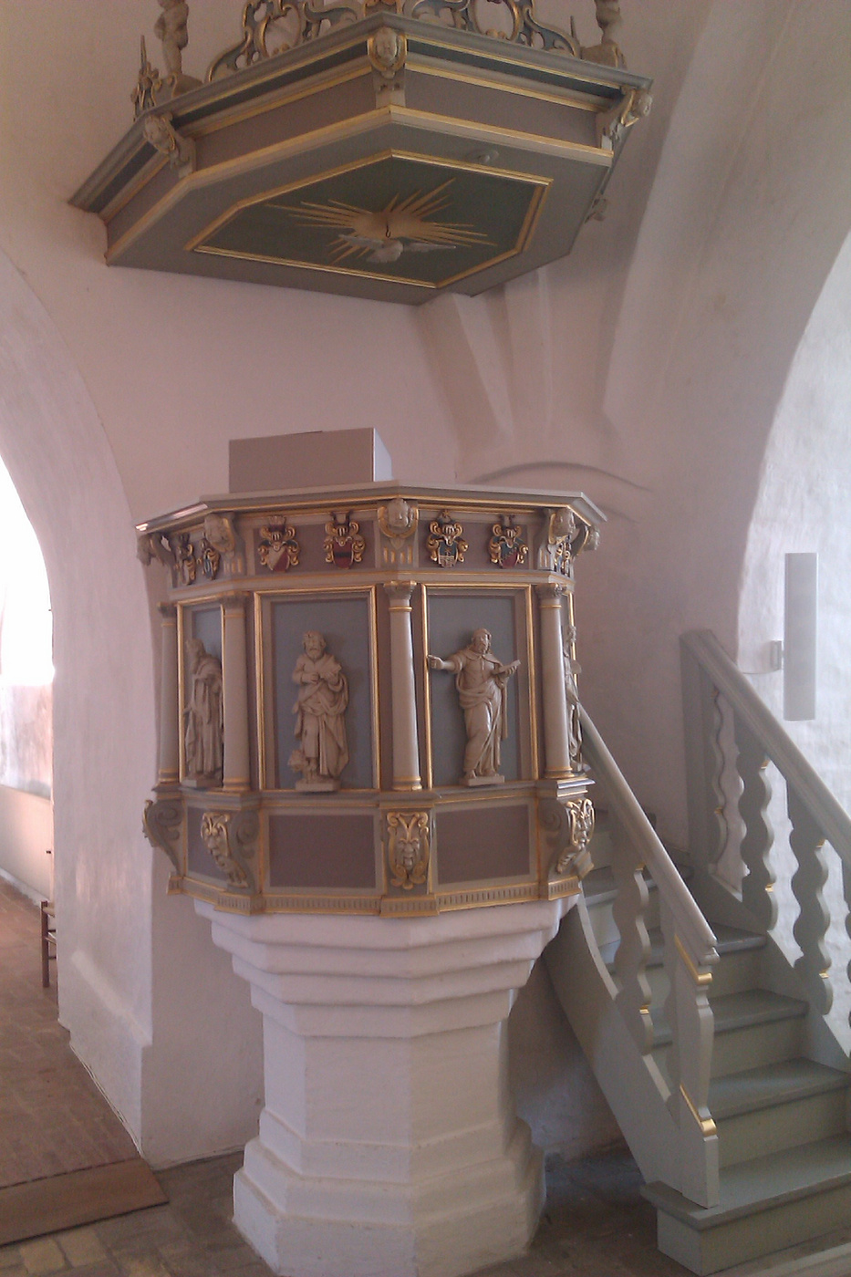 Prædikestolen er fra 1630-1640. Den er med tydelige træk af renæssance; de strenge firkanter og kun én søjle ad gangen som adskillelse. Prædikestolen er prydet med fire udskårne figurer, sandsynligvis de fire evangelister. Fra venstre er det Matthæus med en engel, derefter Markus med løven. De to sidste er der usikkerhed om, da de ikke er udstyret med de kendte symboler (Lukas - en okse og Johannes - en ørn). Under hver søjle sidder der forfærdelige djævle, og over stolen svæver helligåndsduen. Helt på toppen står engle, der skal symbolisere Jesu lidelsesredskaber.