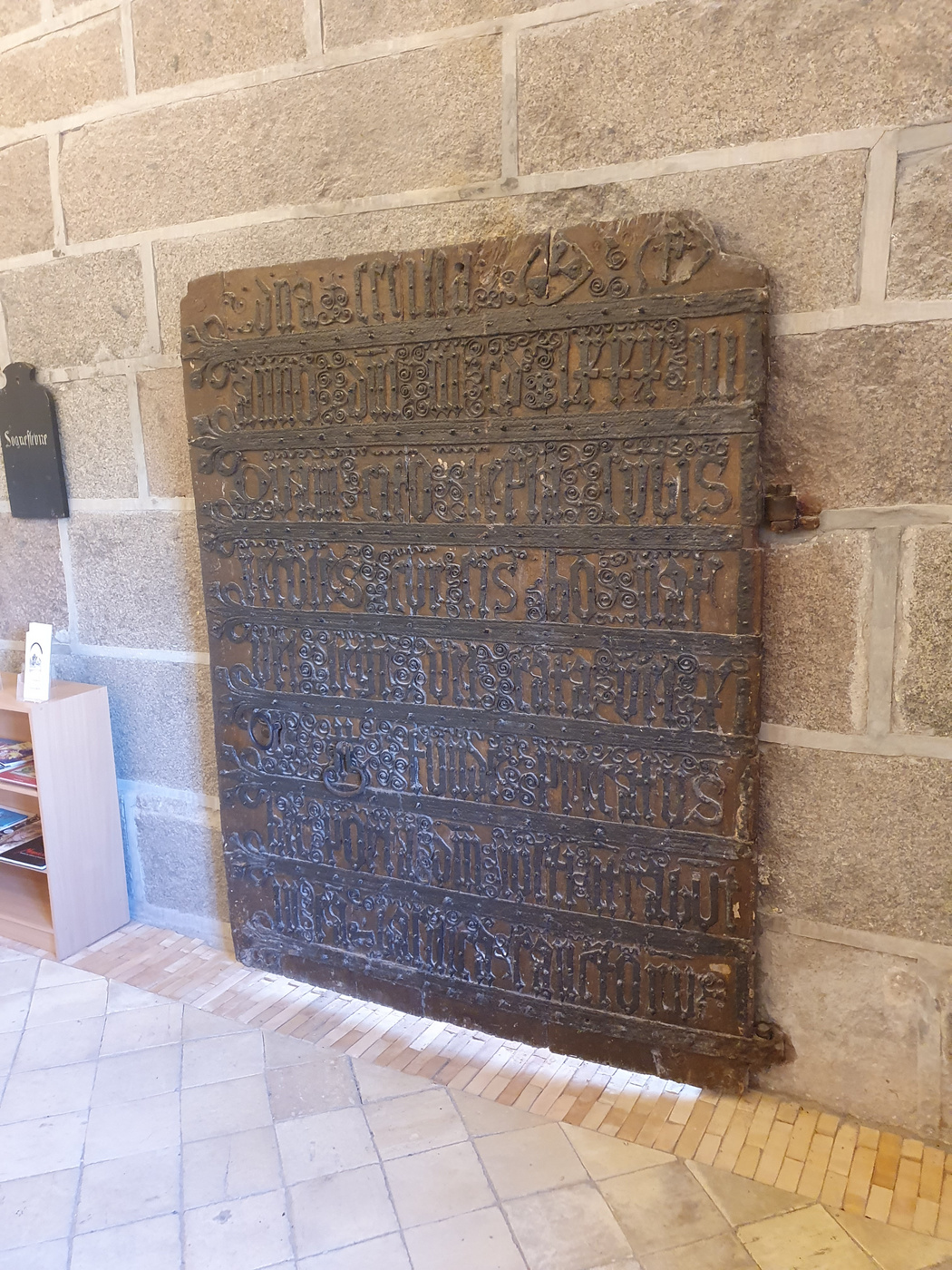 Døren bærer præg af, at den gode giver selvfølgelig skal have sig selv nævnt først, og så på latin. Med forkortelser, står her domina (fru), Cecilia og hendes våbenskjold. I næste linje står årstallet 1483, som er det år, hvor døren er givet til kirken.
