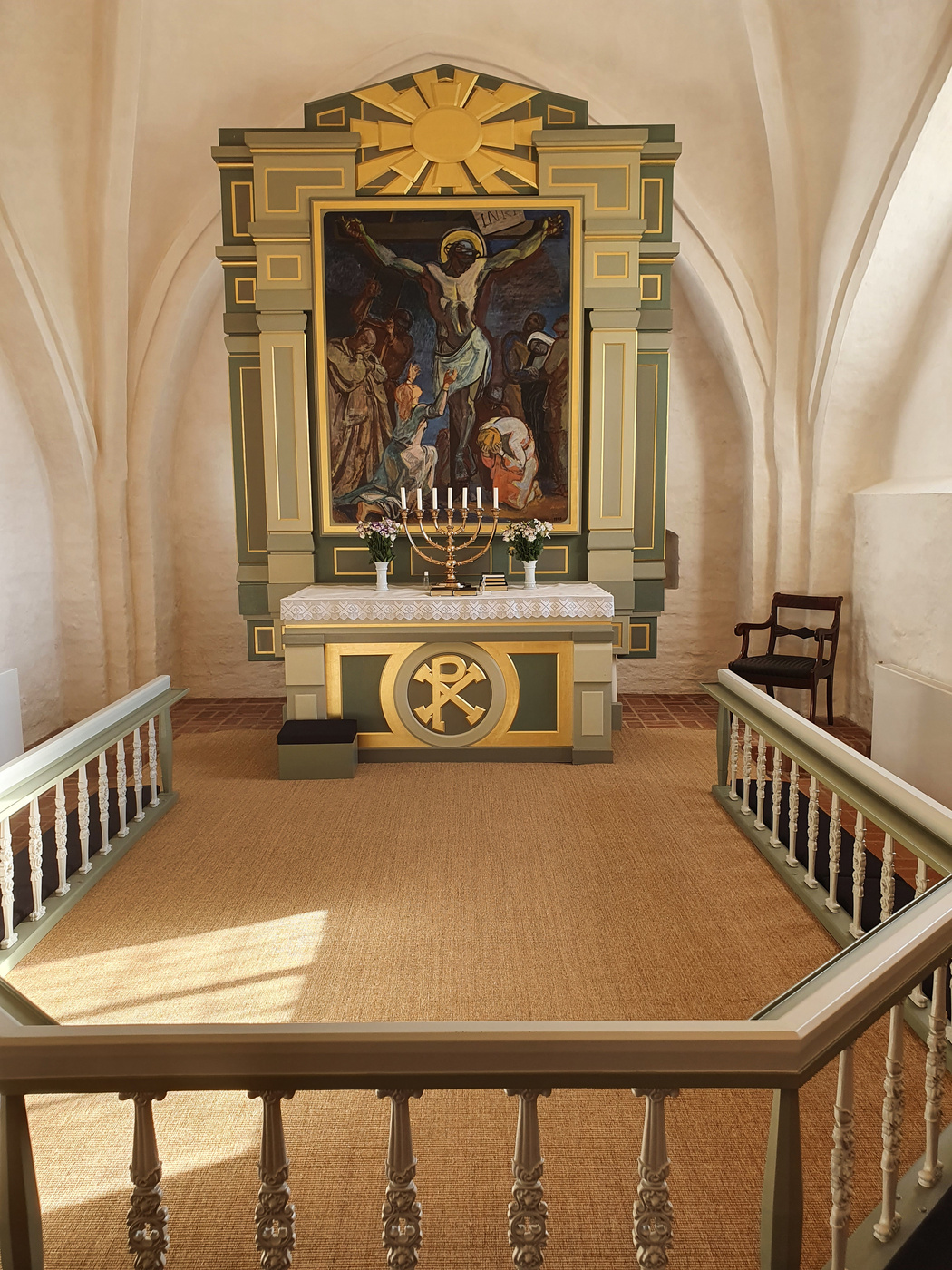 På forsiden af alterbordet ses det forgyldte Kristus-monogram, som sidenhen er blevet kirkens og sognets logo. Det benyttes nu i det officielle stempel til attester og på kirkens brevpapir m.m.